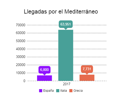 Desde enero de 2017 hasta junio de 2017, 75.185 personas han llegado a Europa por el Mediterráneo. De ellas, 7.731 fueron a Grecia, 63.951 a Italia, 6.800 a España y 302 a Chipre. Comparado con el mismo período el año pasado, Grecia ha tenido una disminución del 97%, probablemente un resultado del Acuerdo entre UE y Turquía, mientras que los otros tres países experimentaban un aumento. La mayoría de los refugiados y migrantes entraron la Unión Europea a través de tres rutas principales: la ruta Mediterráneo Central desde el norte África a Italia; la ruta Mediterráneo Oriental desde Turquía a Grecia, Bulgaria y Chipre; y la ruta Mediterránea Occidental desde el norte de África a España. 2016 fue registrado como el año más mortífero con 5.096 muertes en el mar. Desde que desaparecieron las operaciones Mare Nostrum y Triton para rescatar a los que se aventuran a cruzar por mar, ya ha habido 1.853 muertes en el Mediterráneo desde enero 2017.